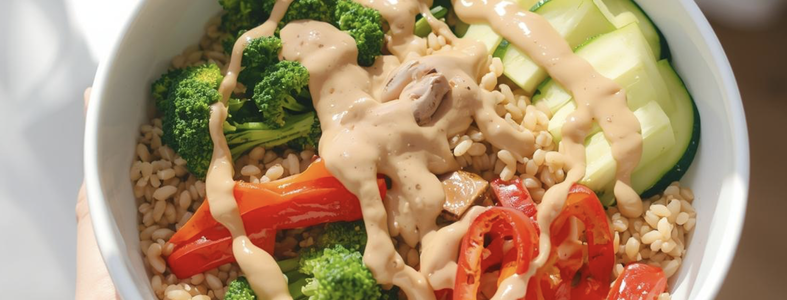 Warm Farro Bowl with Roasted Vegetables & Tahini Drizzle